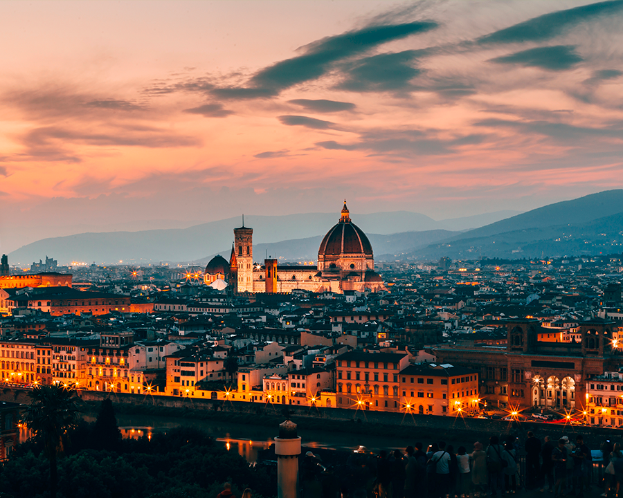 Explore the elegant city of Florence, nestled between a line of hills and the banks of the Arno River.